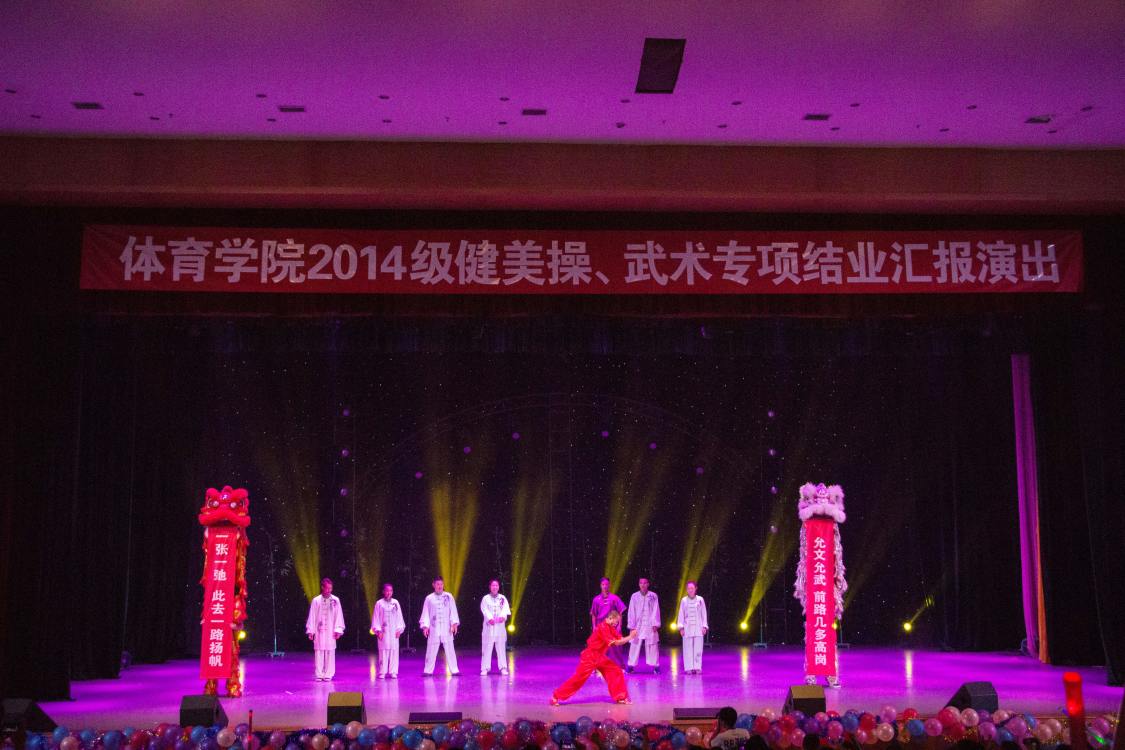 历经两个月的紧张筹备,学院2014级健美操、武术专项结业汇报演出于16日19:00在音乐厅隆重举行。学生处(部)处长陈官章、团委书记于贵、人事处处长张皓、金年会jinnianhuicom2007届毕业生及我院的领导和老师们莅临晚会现场,同时各二级学院学生干部代表也应邀出席。晚会围绕“专业结业汇报”为主题,有极具专业特色的健美操、排舞、啦啦操、街舞、跆拳道、武术、舞狮等节目形式,整场晚会高潮迭起、精彩纷呈。