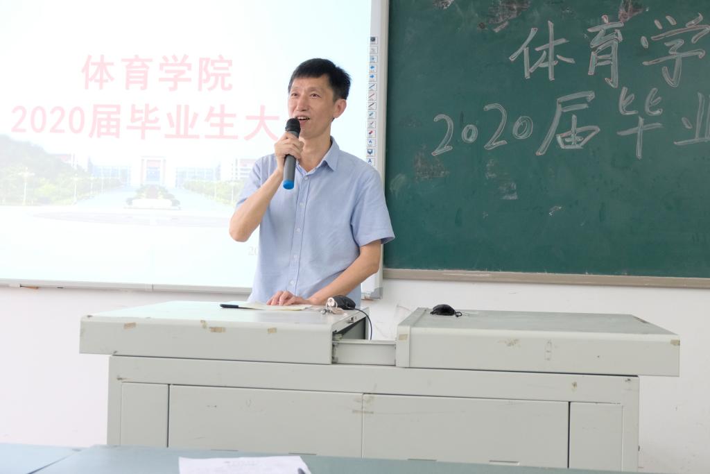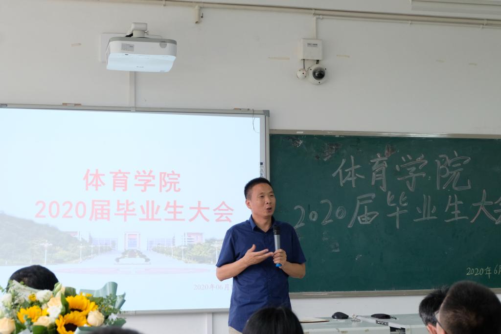 会议第四项,学院领导相继进行了发言。孙亮亮:“学子要不忘初心、时刻坚守体育人本色,在磨练中提高水平、增强本领。将艰难困苦、玉汝于成的文理精神保持和发扬下去,并带到以后的生活、学习和工作中。”彭波:“奋斗是青春最靓丽的底色,生命不止、奋斗不息。青年学子应该把自己的奋斗与国家的发展、民族的命运相统一,在实现国家富强、民族复兴、人民幸福的中国梦中实现自己的人生价值。不管何时何地,母校永远是大家温暖的港湾,老师永远是大家坚强的后盾。”佘涛:“我们要坚定对党的信仰、对体育的信念。不放松学习,不放弃学习。有了信念和持之以恒的精神,即使未来的道路上遇到艰难险阻,一切困难都会迎刃而解”。王兆忠:“毕业不是结束,而是新的开始。在过去四年,同学们成功后的喜悦,也有失败后的沮丧,这些都是大家成长中的积淀,是难得的财富。请记住曾经点醒过你的老师,他们的一句话可能改变了你的命运;请记住曾经骂过你的老师,因为他们爱你最深;请记住曾经的得失,得之不易,要珍惜,失之是伤,伤不起;记住文理,记住体院,这里是你们曾经的家,欢迎同学们常回家看看”