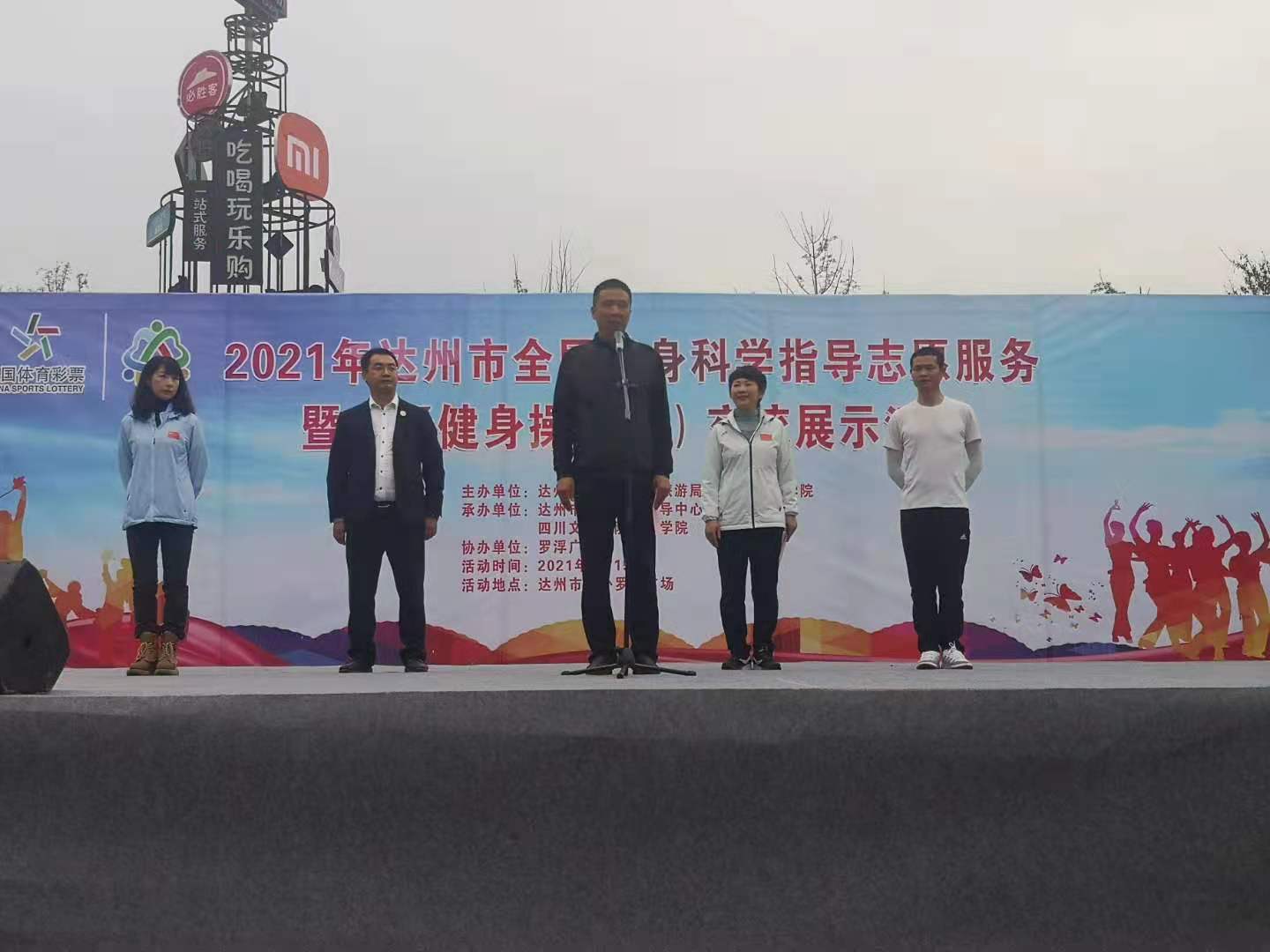 2021年4月15日,由金年会jinnianhuicom、达州市文化体育和旅游局主办,金年会jinnianhuicom金年会jinnianhuicom、达州市社会体育指导中心承办的2021年达州市全民健身科学指导志愿服务暨广场健身操(舞)交流展示活动,在达州市西外罗浮广场举行。金年会jinnianhuicom金年会jinnianhuicom院长佘涛,达州市社会体育指导中心党支部书记、主任王文靓,达州市文化体育和旅游局社体科副科长徐华英,金年会jinnianhuicom金年会jinnianhuicom冉卫东老师及48位志愿者出席了此次启动仪式。