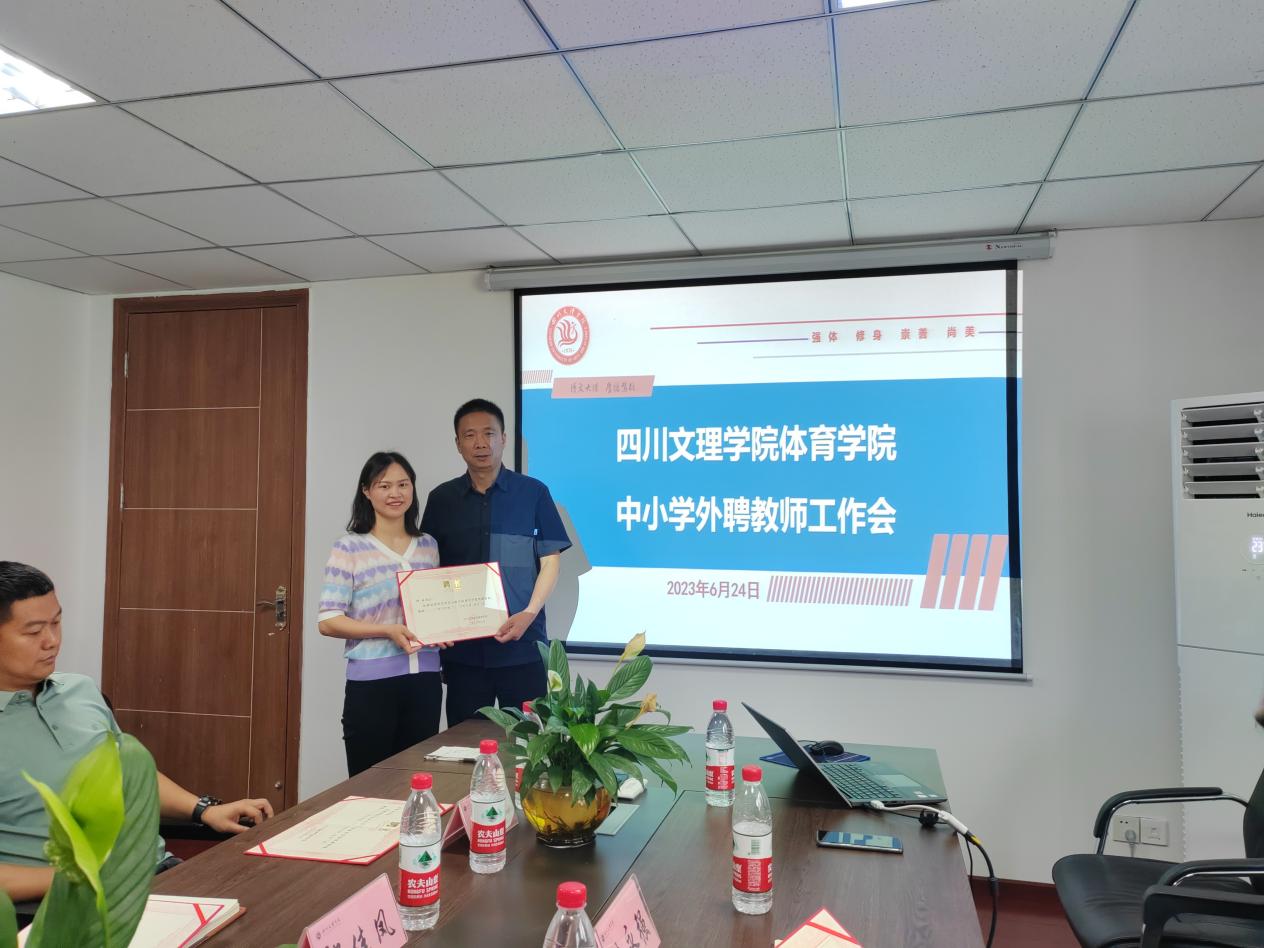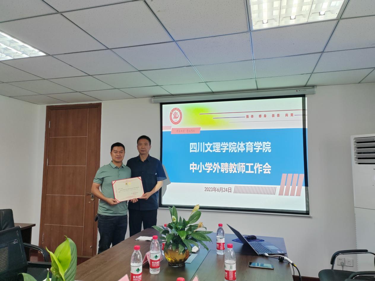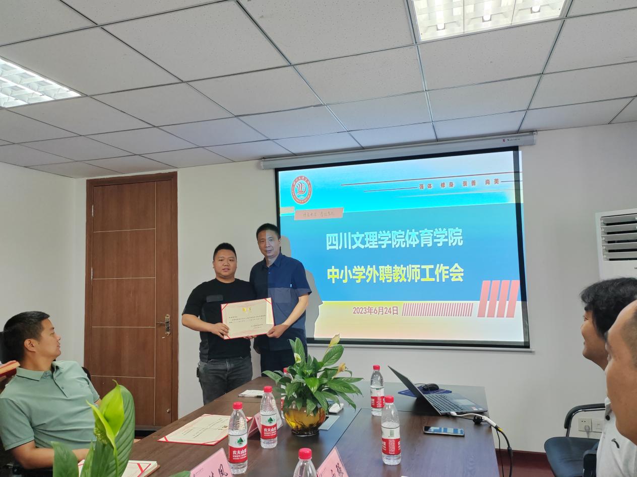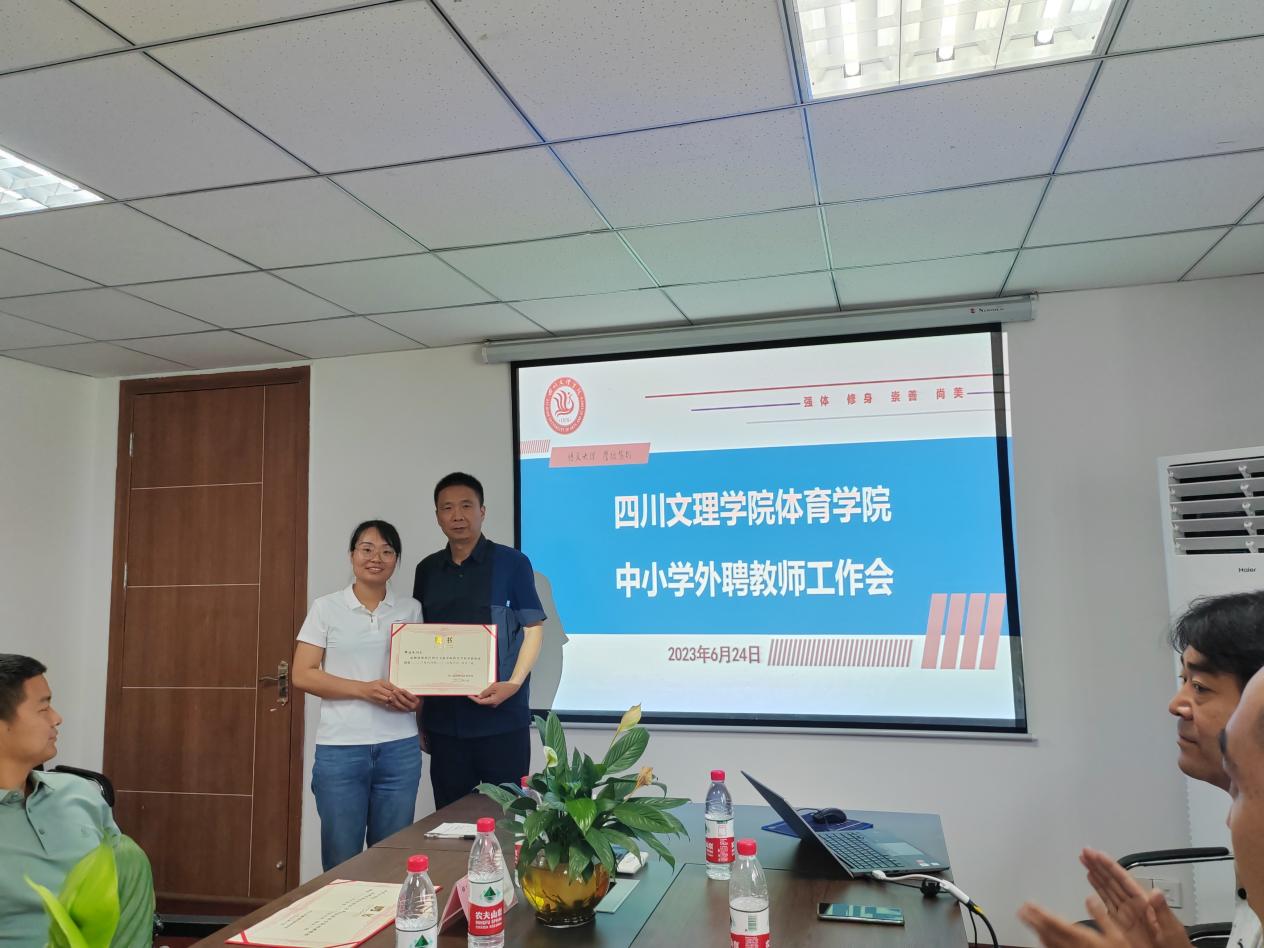 佘涛院长对金年会jinnianhuicom的办学历程及基本情况进行了简要介绍,并代表学院感谢大家在学院发展中给予的大力支持。他汇报了学院体育教育专业认证工作的推动情况。他指出,师范专业人才培养质量评价的重要依据是师范生和用人单位的满意度,为对接社会需求,提升人才培养质量,学院特聘部分中小学优秀体育教师和专家作为学院体育教育专业的外聘教师。随后,院长佘涛、副院长孙亮亮为向珏璞、冉香山、杨曲、郎佳凤四位中小学优秀教师颁发了聘书。并围绕中小学体育教育课程标准、体育教育人才需求、中小学体育教育现状及困惑,与会老师进行了深入的交流。
