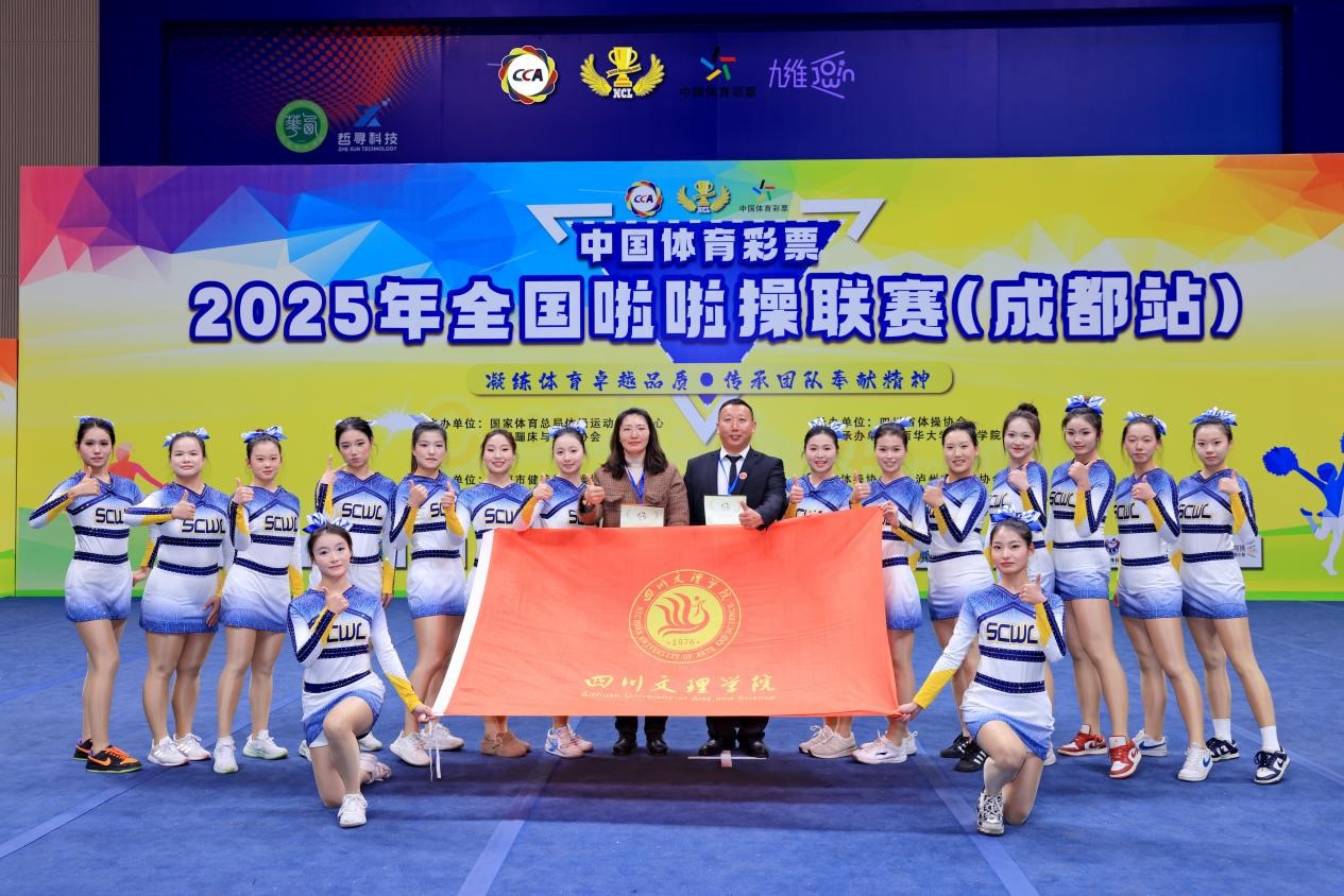 近日,2025年全国啦啦操联赛(成都站)在西华大学圆满落幕。我院青云啦啦队凭借扎实的专业功底、默契的团队协作,在众多参赛队伍中脱颖而出,一举斩获公开青年甲组花球规定动作(2025版)初B第二名、公开青年甲组集体花球自选动作第三名的优异成绩。