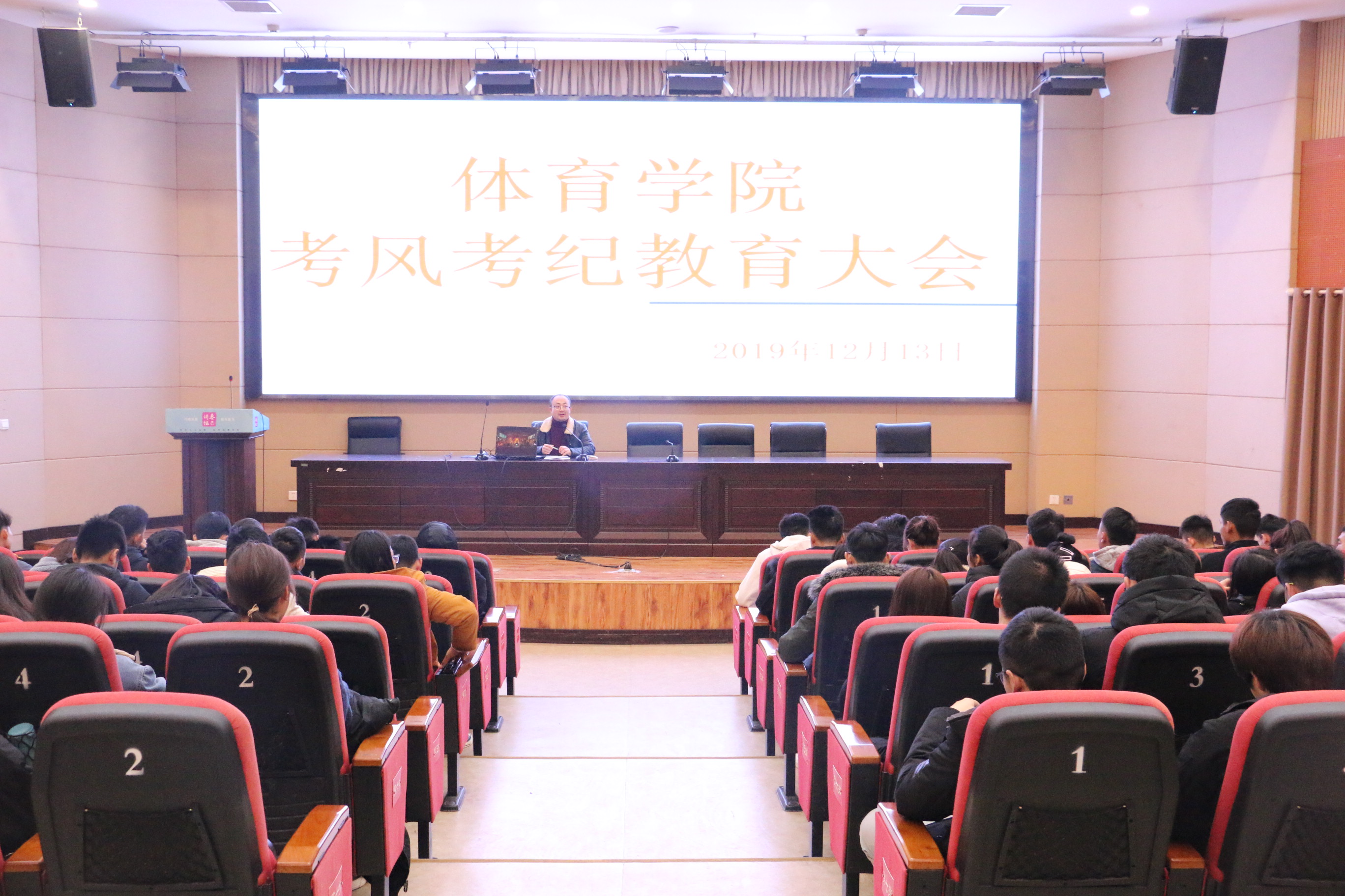 2019年12月13日16:50,金年会jinnianhuicom在学术报告厅A厅召开2019年考风考纪教育大会。参加本次会议的有党总支书记王兆忠、院长佘涛、党总支副书记彭波、学工办主任祝利平、辅导员石姣娜以及全体修业班学生。