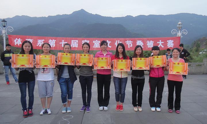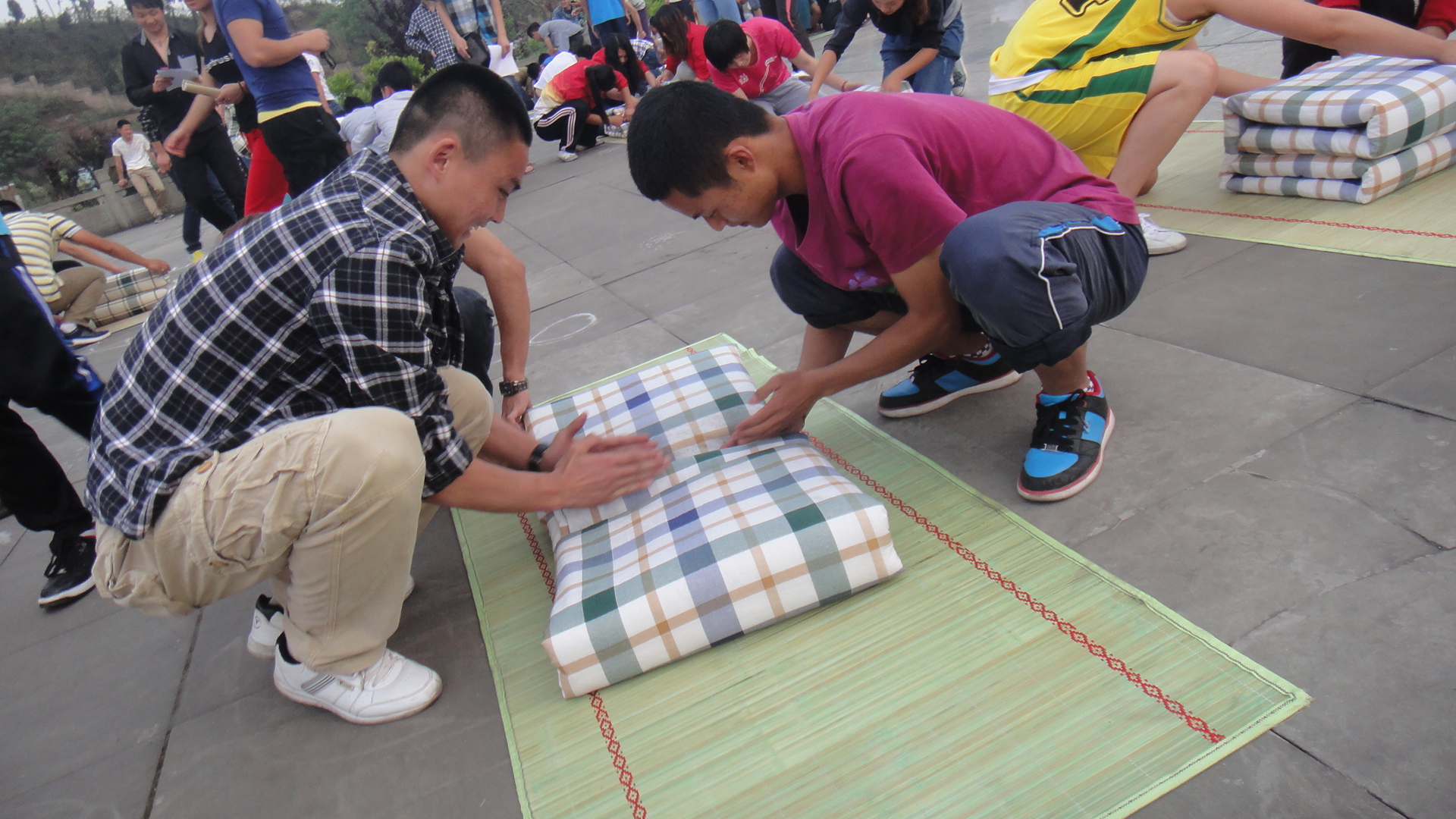 同学们准备好了被子和席子在比赛场地等待比赛,每个寝室派出了三名代表参赛,同学们都满怀信心的向着第一名进发。比赛限时两分钟,同学们在短暂的时间里,既紧张又兴奋。比赛哨音一响,每位参赛成员的动作都很迅速,很快就把被子叠成了豆腐块。最后,前三名的寝室代表在一起合影留念。