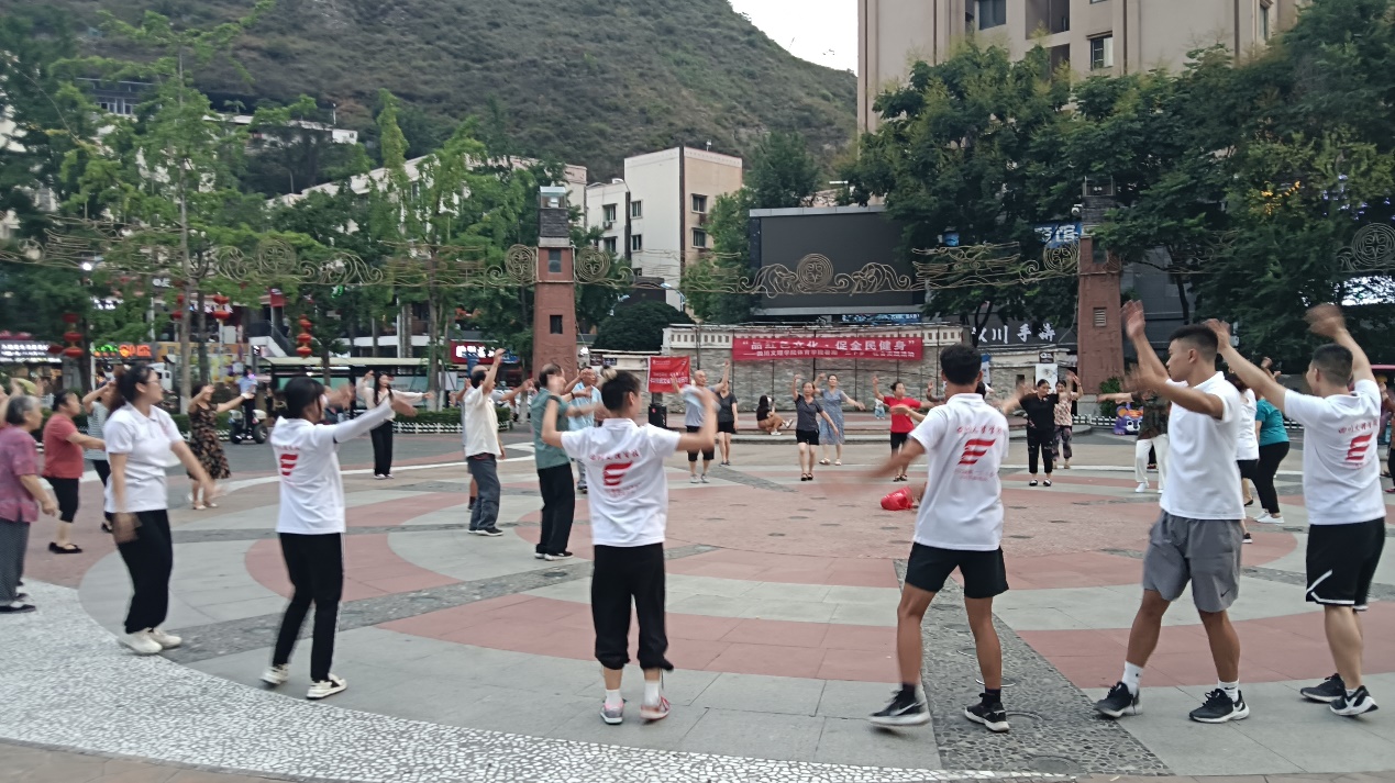 8月19日下午,践行团在汶川县威州镇锅庄广场组织当地居民(约100人)一起开展了全民健身活动。活动结束后当地居民热情邀请践行团成员一同参与当地特色广场舞锅庄舞。