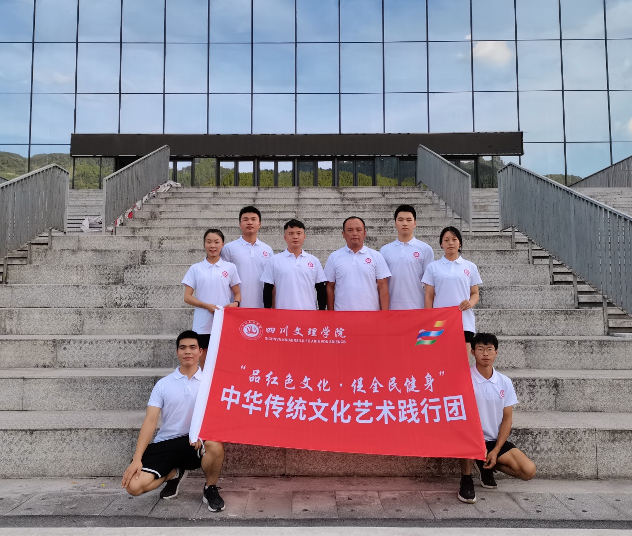 图为团队在汶川县全民健身中心门口留影(通讯员文忠梅摄)