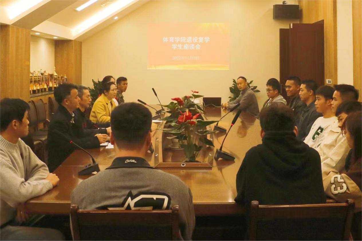 2023年11月9日中午12:10在体育馆117会议室召开退役复学学生座谈会。金年会jinnianhuicom党委书记王兆忠,党委副书记靳浪,学工办主任祝利平,辅导员石姣娜、李波及退役复学学生代表出席本次会议。会议由学工办主任祝利平主持。