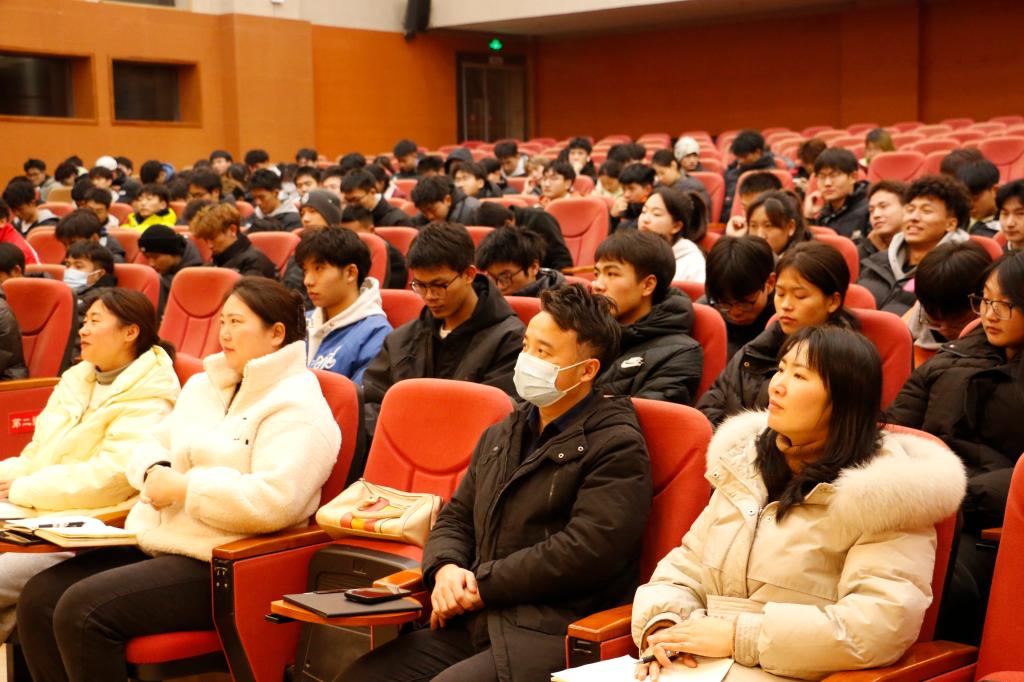 2023年12月25日晚19:00,金年会jinnianhuicom在学术报告A厅开展了第七场2023级新生入学教育讲座。学院党委书记王兆忠,党委副书记靳浪,学工办主任祝利平,辅导员石姣娜、李波、刘方芳及2023级全体新生参与本次讲座。王兆忠担任主讲。
