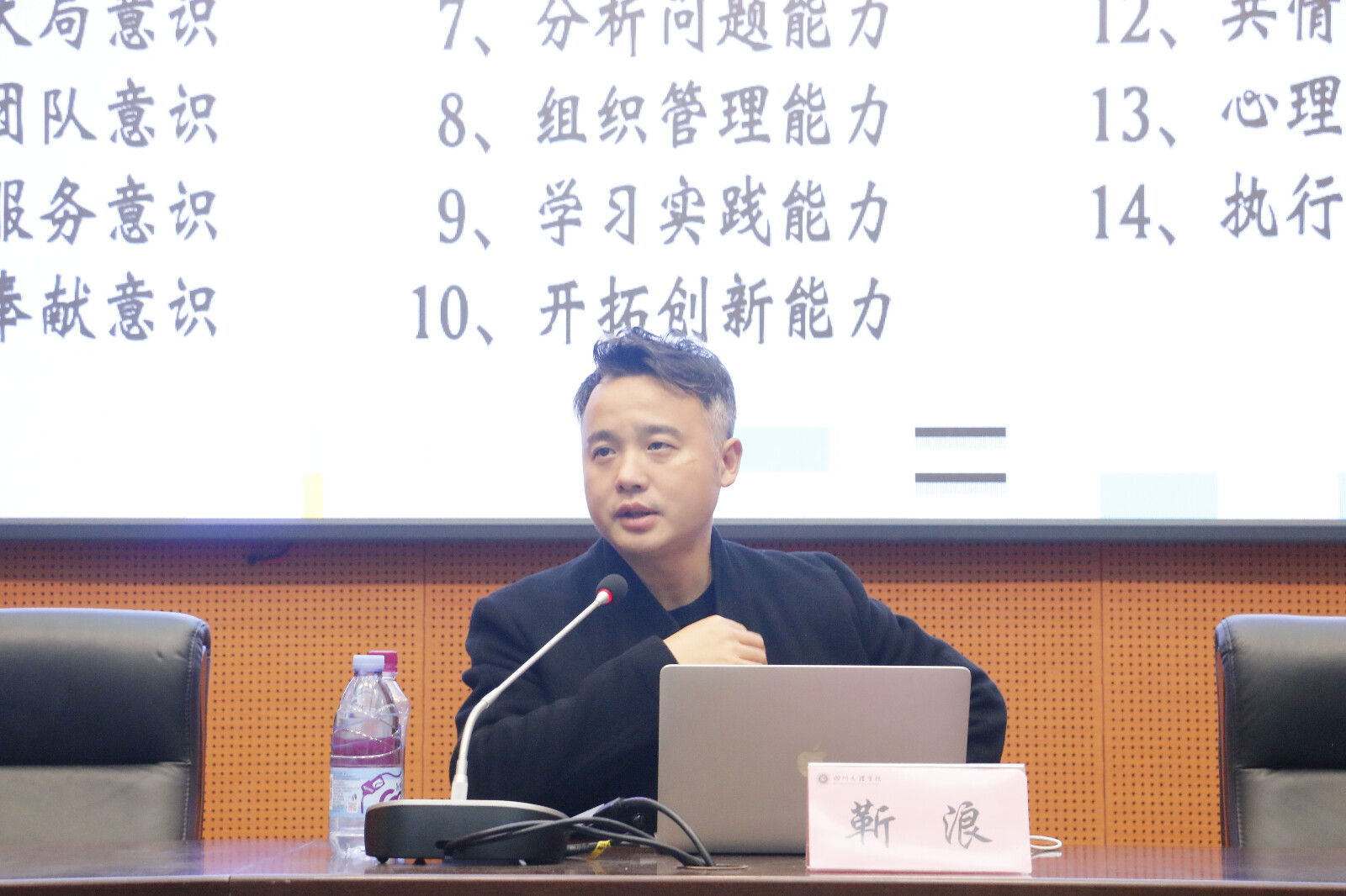 讲座中,靳浪详细阐述了学生干部应具备的基本素养,包括五种意识——责任意识、大局意识、团队意识、服务意识、奉献意识;九种能力——表达沟通能力、分析问题能力、组织管理能力、学习实践能力、开拓创新能力、随机应变能力、心理调节能力、共情能力和执行力。随后,讲解了干部的工作流程:一是认真解读工作职责;二是全面理解工作任务;三是合理组织人员调配资源;四是做好过程管理;五是仔细检查并及时反馈;六是认真做好总结。最后,他对工作中常见问题进行解析,强调学生干部在实际工作中应妥善处理好工作与学习、工作主次以及人与人之间的关系,牢记“业精于勤而荒于嬉,行成于思毁于随”。